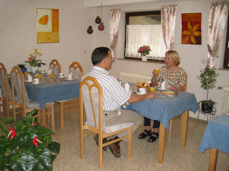 Genießen Sie das reichhaltige und abwechslungsreiche Frühstück. Der Frühstückstisch ist reichlich gedeckt, mit frischen Brötchen, Brot, Butter, Eiern, Wurst, Marmelade, Käse, Quark, Joghurt, Honig und Müsli. Zu trinken erhalten Sie wahlweise Kaffee, Tee, Milch oder Kakao. Dazu gibt es täglich ein Glas Orangensaft. Den Frühstückraum können Sie auch tagsüber oder am Abend für ein geselliges Beisammensein in gemütlicher Runde nutzen.